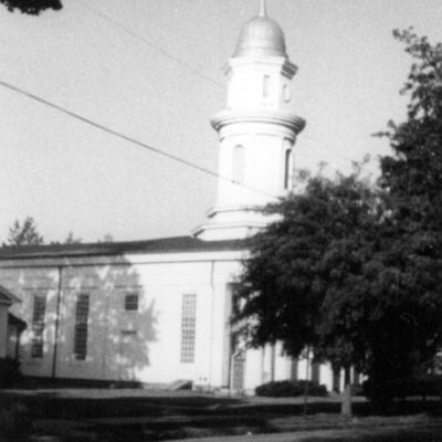 This photograph dates before the parsonage was built to the west of the church, and before the stained glass window was added above the front door. Copy of original photo; source not noted