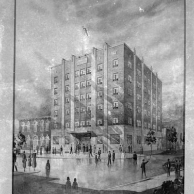 Photograph of architectural rendering. Centennial Book 86. This building was planned to be on the southwest corner of Front Street and South Avenue (now Veterans Square), but it was never built.