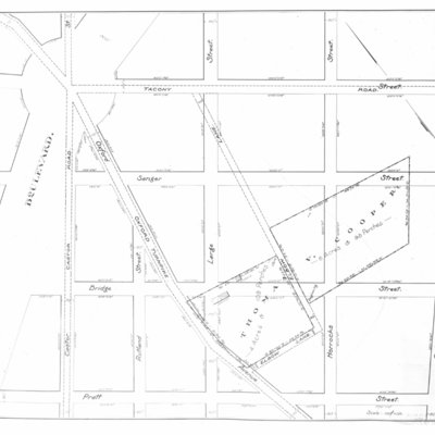 Copy of survey showing about 10 acres of property of Thomas V. Cooper in Philadelphia near Oxford Ave. and Horrocks St. (formerly Oxford Turnpike and Elbow Lane), adjacent to Roosevelt Boulevard. Plan created by William E. Skyrm, drarughtsman, 1904,…