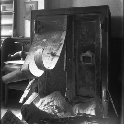 See description at AP-8356. A bottle on a ledge by the safe, somehow unbroken after the explosion, bears this label: Pomeroy's Combined Writing & Copying Fluid. Flows Freely, Will Not Mould. Newark, N.J. One letter sits on the floor in front of the…