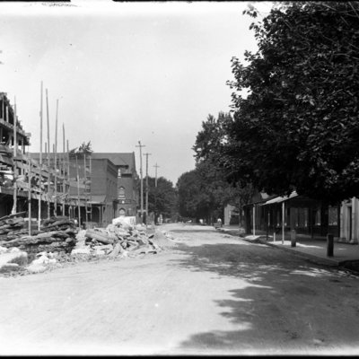 Pennsylvania National Guard Armory under construction. Looking west on State St. from about Church St. View also shows John Bader Meat Market, under awning on right.