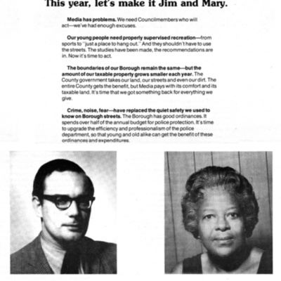 Campaign literature for Mary Edwards and James J. Cunningham, Jr. running together on the Democratic ticket for Media Borough Council in 1975.