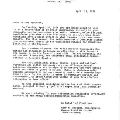Letter to Media Borough Democrats urging them to vote for the Media Democratic Committee endorsed slate of candidates. Signed by chair, Mary Edwards and vice chair, Chesterfield M. Cotton