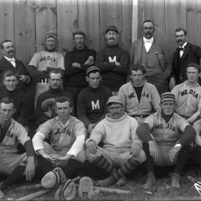 Probably Media Athletic Association team. List of players on reverse of two copies, each list slightly different: Top row, left to right: Mike Fahey, Bill (or Lane] Davis, Frank Dotts, Reds Pyle (or ____ Simcox), ____, Cliff Mooney, Marshall Harvey,…