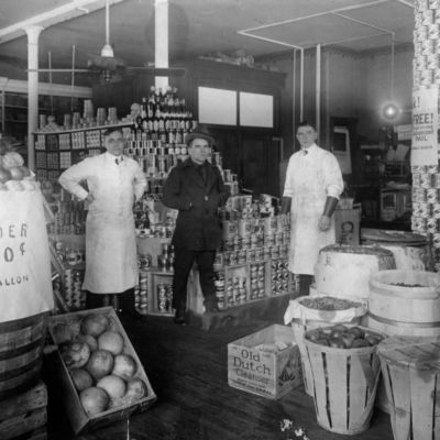 Lees caption: "Formerly Rorer's Grocery." Amazing displays of produce and towers of canned goods. "Cider, 40 cents gallon"